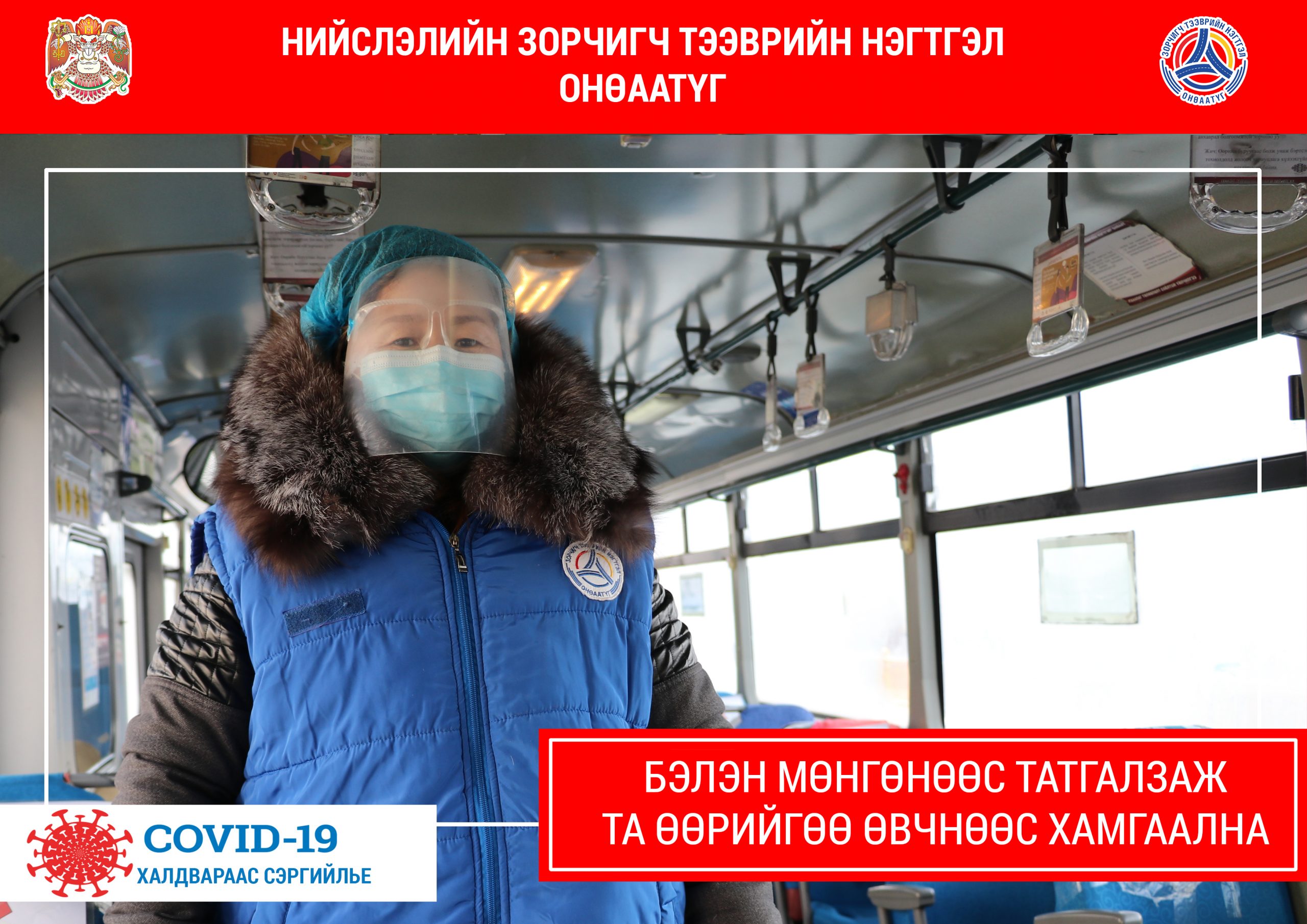 “Covid-19” халдвараас урьдчилан сэргийлэх ажлын хүрээнд “Зорчигч тээврийн нэгтгэл” ОНӨААТҮГ –ын 1, 2 дугаар баазын 57 шалгагч, захиргааны 40 ажилтан албан хаагч шугам замын хяналт шалгалтын ажлын хүрээнд зорчигчдод амны хаалт зүүж, бээлий өмсөн, хоорондын зай барьж, бэлэн мөнгөөр зорчихгүй байх зөвлөмжийг өгч байна. Шугам замын хяналтыг Төв номын сангийн буудлаас Хүннү молл, 10-р хорооллоос Баруун 4-н зам, Хорооллын эцсээс Ахуйн үйлчилгээний ордны буудлуудад хийж байна. Нийт 283 тээврийн хэрэгслийн гадна тал, заалны дотор талын угаалга цэвэрлэгээ, ариутгалыг өглөө, өдөр, оройн буултаар бүр 59-60 шалгагч хийж, зориулалтын бодисоор ариутгаж байна. Халдвар хамгааллын дэглэмийг баримтлан шугамын үйлчилгээнд ажиллаж буй жолооч, хяналтын ажилчдыг амны хаалт, бээлий, ариутгалын хувцас, спиртэн суурьтай гар халдваргүйтгэгч уусмалаар өдөр бүр хангаж, 202 тээврийн хэрэгсэлд байршуулсан гар ариутгагчийг тогтмол цэнэглэж, жолоочийн кабины тусгаарласан хаалт хамгаалалтыг бүрэн байдлыг шалгаж байгаа юм.